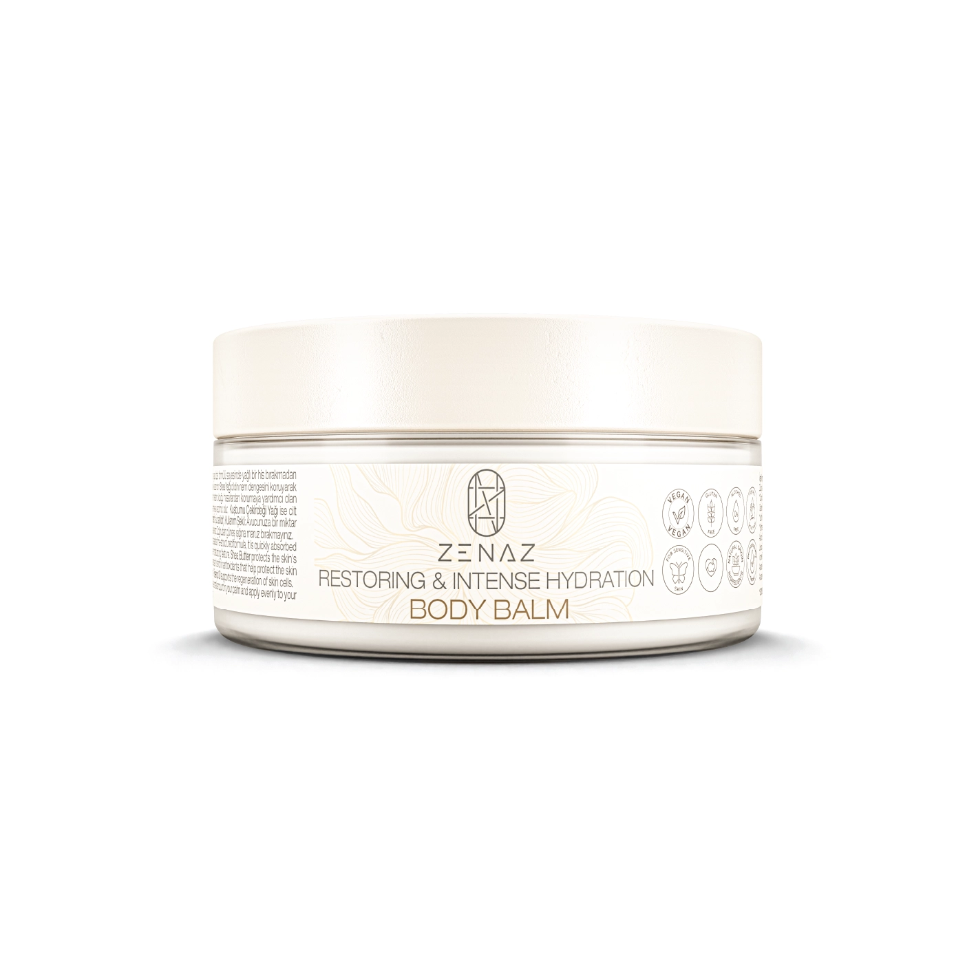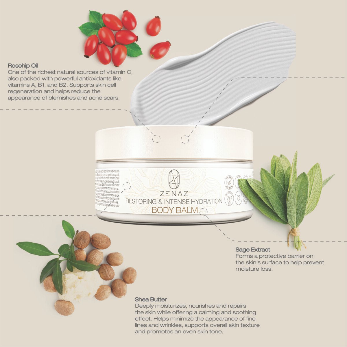 Zenaz Restoring & Intense Hydration Body Balm intensively moisturizes your skin, offering a velvety, smooth and radiant experience. Due to its special fine-textured formula, it is quickly absorbed without leaving an oily feeling. *Salvia Sage Extract helps renew skin cells with its antioxidants, giving the skin brightness and vitality with its intense moisturizing feature. *Shea butter protects the skin’s moisture balance, prevents loss of elasticity and strengthens the skin’s natural texture, providing a more vibrant, smooth and flexible skin appear- ance. It is rich in antioxidants that help protect the skin from damage caused by free radicals. It helps prevent the appearance of light lines and wrinkles, care overall skin texture and balance skin tone. *Rosehip oil supports the regenera- tion of skin cells. It is suitable for all skin types, especially it is ideal for sensitive skin.