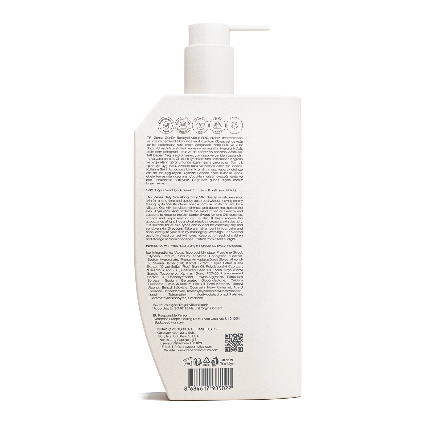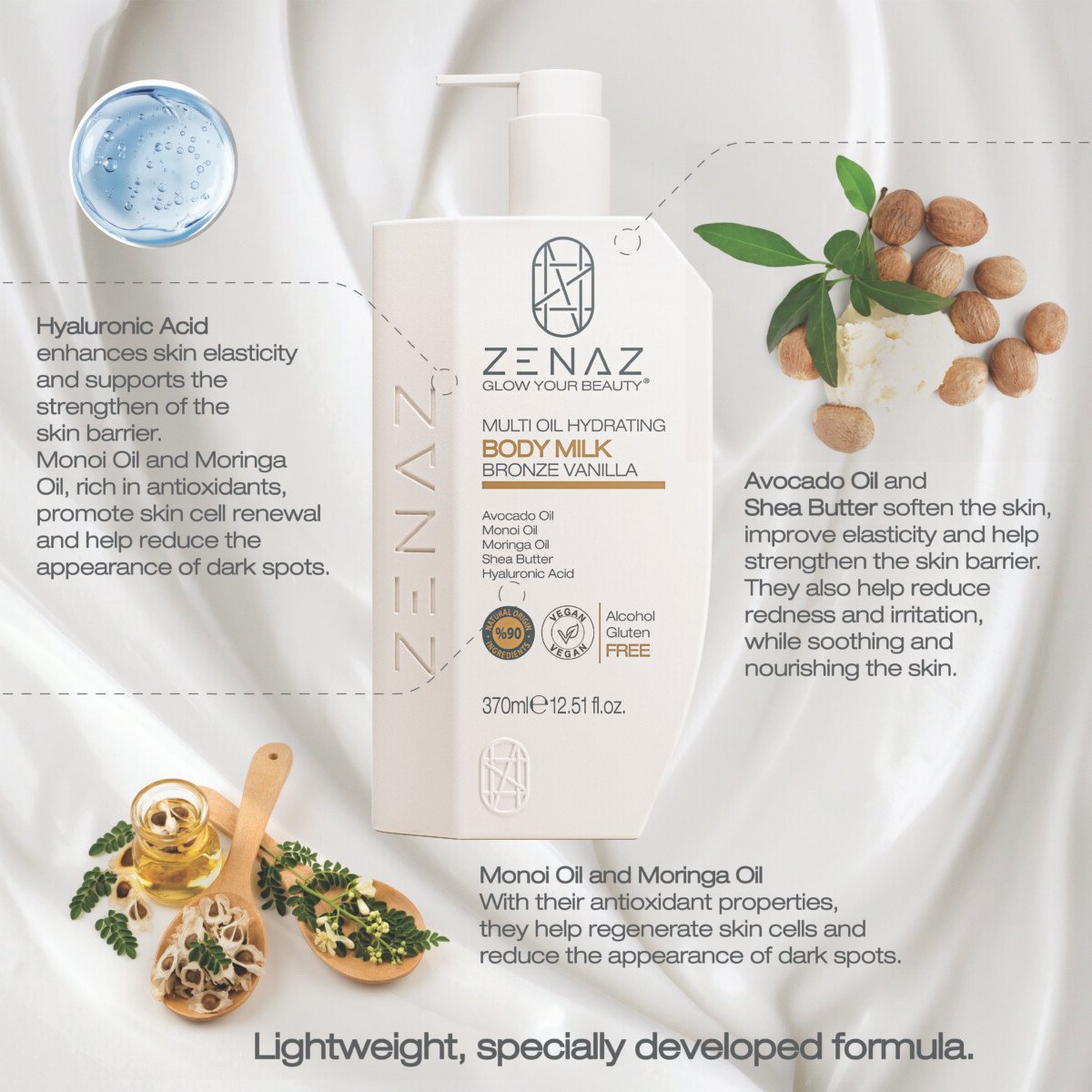 Zenaz Multi Oil Hydrating Body Milk, deeply moisturizes your skin for a long time, helps to reduce redness and irritation on skin, nourishes while sooth- ing it and quickly absorbed without leaving an oily feeling by its fine-struc- tured special formula. With natural oils in its content (Avocado Oil, Monoi Oil, Moringa Oil, Shea Butter) and Hyaluronic Acid, strengthens the skin barrier by increasing the elasticity of your skin with its antioxidant proper- ties, helps to renew skin cells, balance skin tone and reduce the appear- ance of dark spots. It is suitable for all skin types, especially ideal for sensi- tive and dry skin.