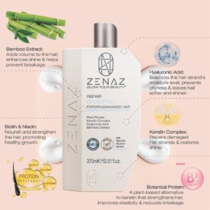 Zenaz Repair Shampoo, strengthens hair strands and increases elasticity with its *Plant Protein and helping to reduce breakage. It also aids in repairing hair damage caused by chemical treatments, heat styling, and environmental fac- tors. *Keratin Complex (Wheat, Soy and Corn Protein) consisting of peptides and amino acids repairs damaged hair strands and adds shine to the hair. *Hy- aluronic Acid, with its intense moisturizing properties, supports the softness of hair strands and provides volume. *Bamboo extract, rich in silica content, helps to strengthen dry and damaged hair and give it a healthy look.