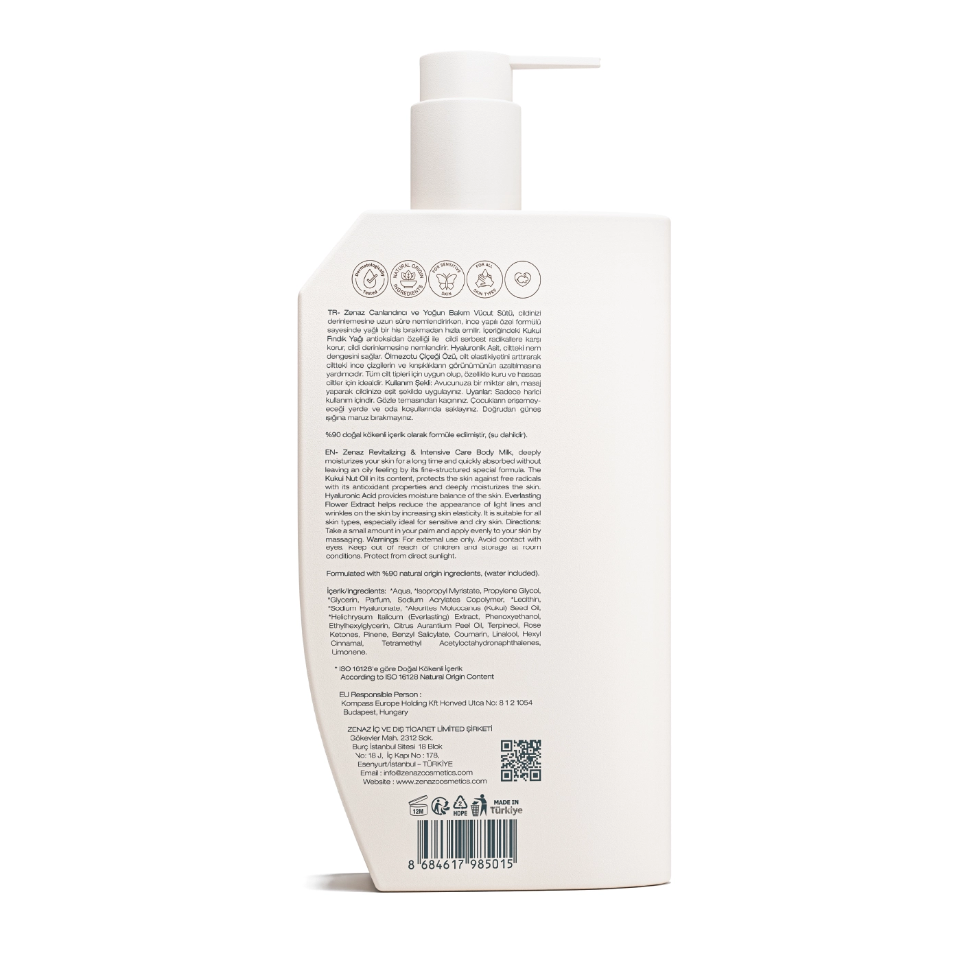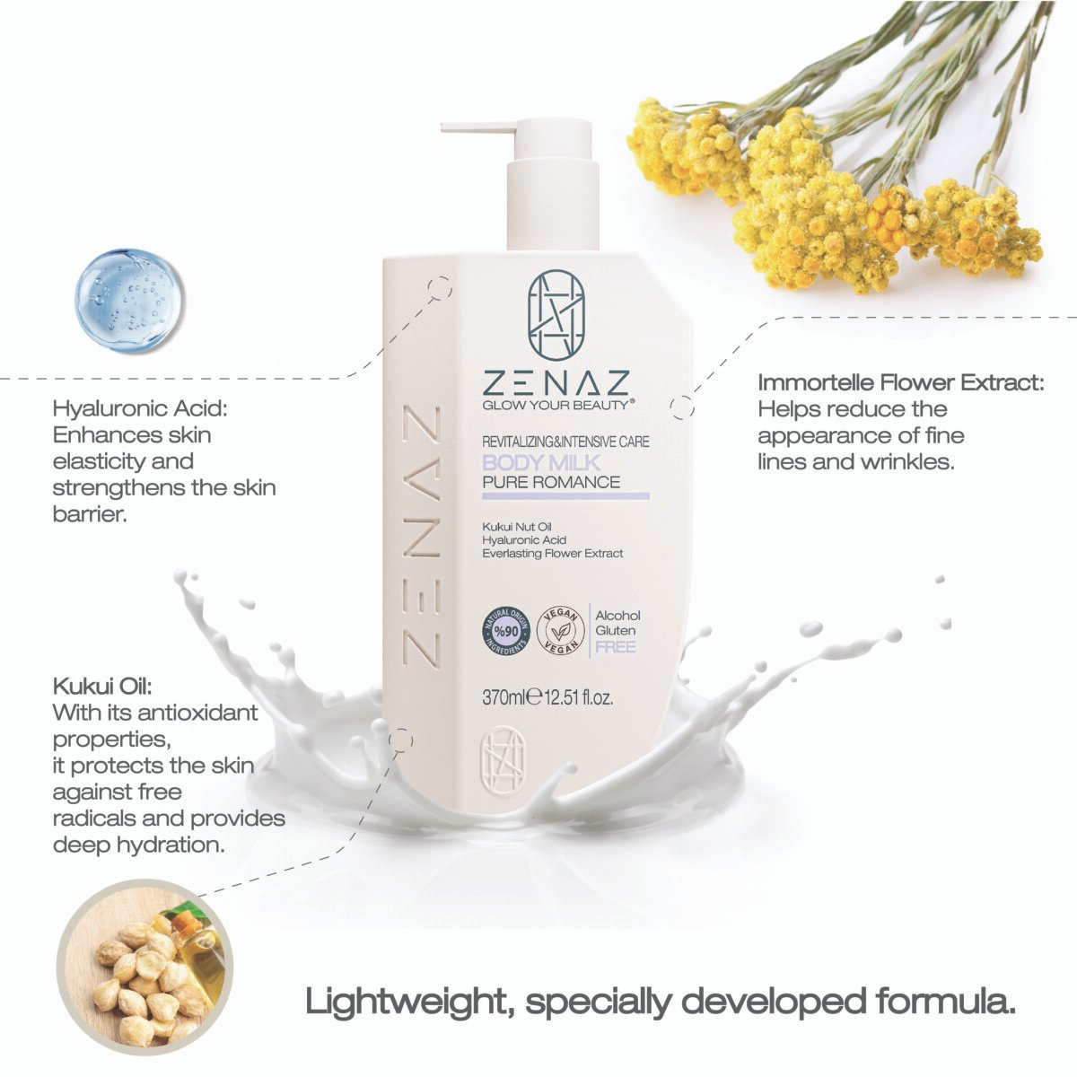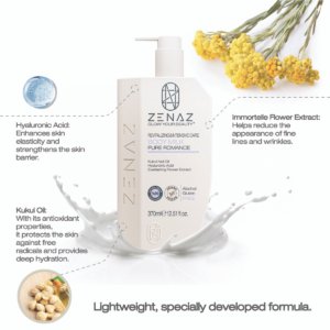 Zenaz Pure Romance Body Milk, the *Kukui Nut Oil in its content, protects the skin against free radicals with its antioxidant properties and deeply moisturizes the skin. *Hyaluronic Acid provides moisture balance of the skin. *Everlasting Flower Extract helps reduce the appearance of light lines and wrinkles on the skin by increasing skin elasticity. With its special fine-structured formula, it is absorbed quickly without leaving an oily feeling. It is suitable for all skin types and is ideal for especially dry and sensitive skin.